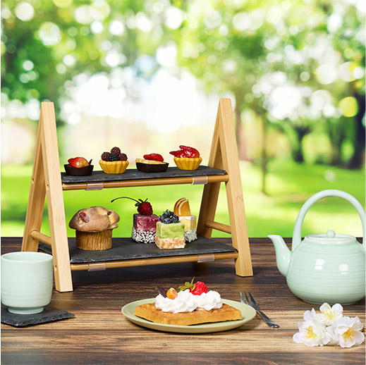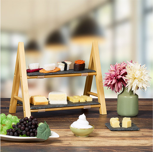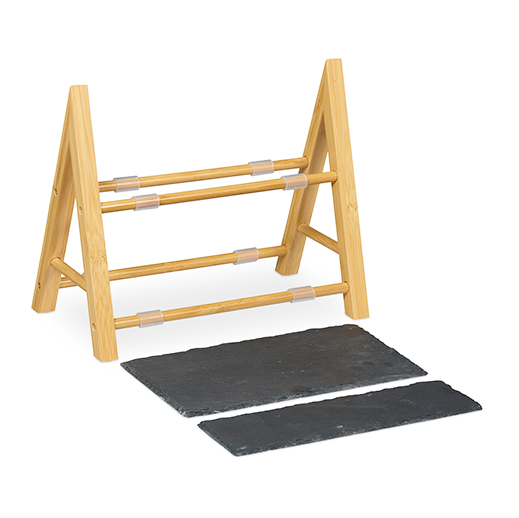 Die Kombination aus warmem Bambus und kühlem Schiefer verleiht der Etagere einen zeitlosen, hochwertigen Look – ideal für gemütliche Abende, Gästeempfänge oder als dekoratives Element in der Küche oder im Wohnzimmer.