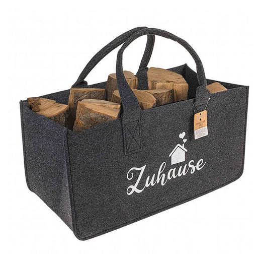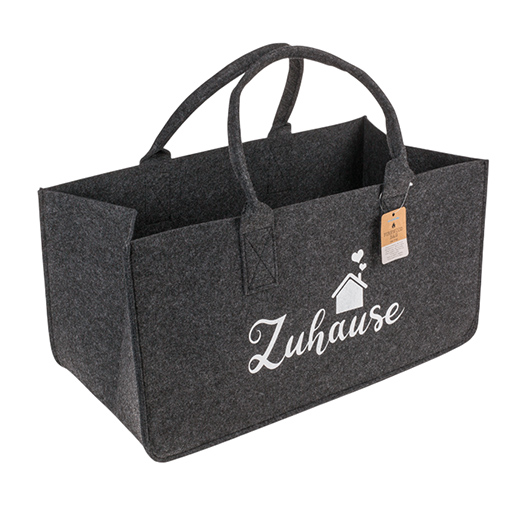 Diese grosse Tragetasche aus Filz in dunkelgrau vereint Funktionalität mit einem wohnlichen Look. Der dezente Schriftzug „Zuhause“ macht sie zu einem echten Blickfang – ob neben dem Kamin oder im Wohnbereich.