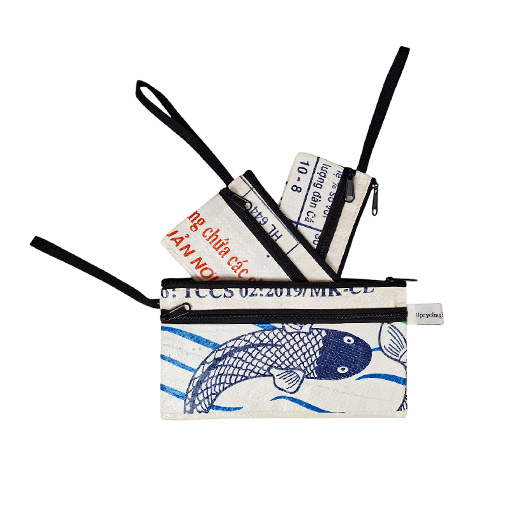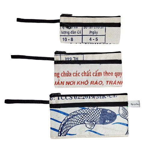 Mit diesem genialen Etui – Set aus drei verschieden grossen Täschchen aus recycelten Fischfuttersäcke sind sie immer bestens ausgerüstet. Durch die drei optimalen Grössen findet alles sein Platz worauf Sie im Alltag oder unterwegs nicht verzichten möchten. Dieses Set ist immer ein Hingucker ob als Handtasche, Kosmetiktasche oder einfach als Stiftmäppchen.